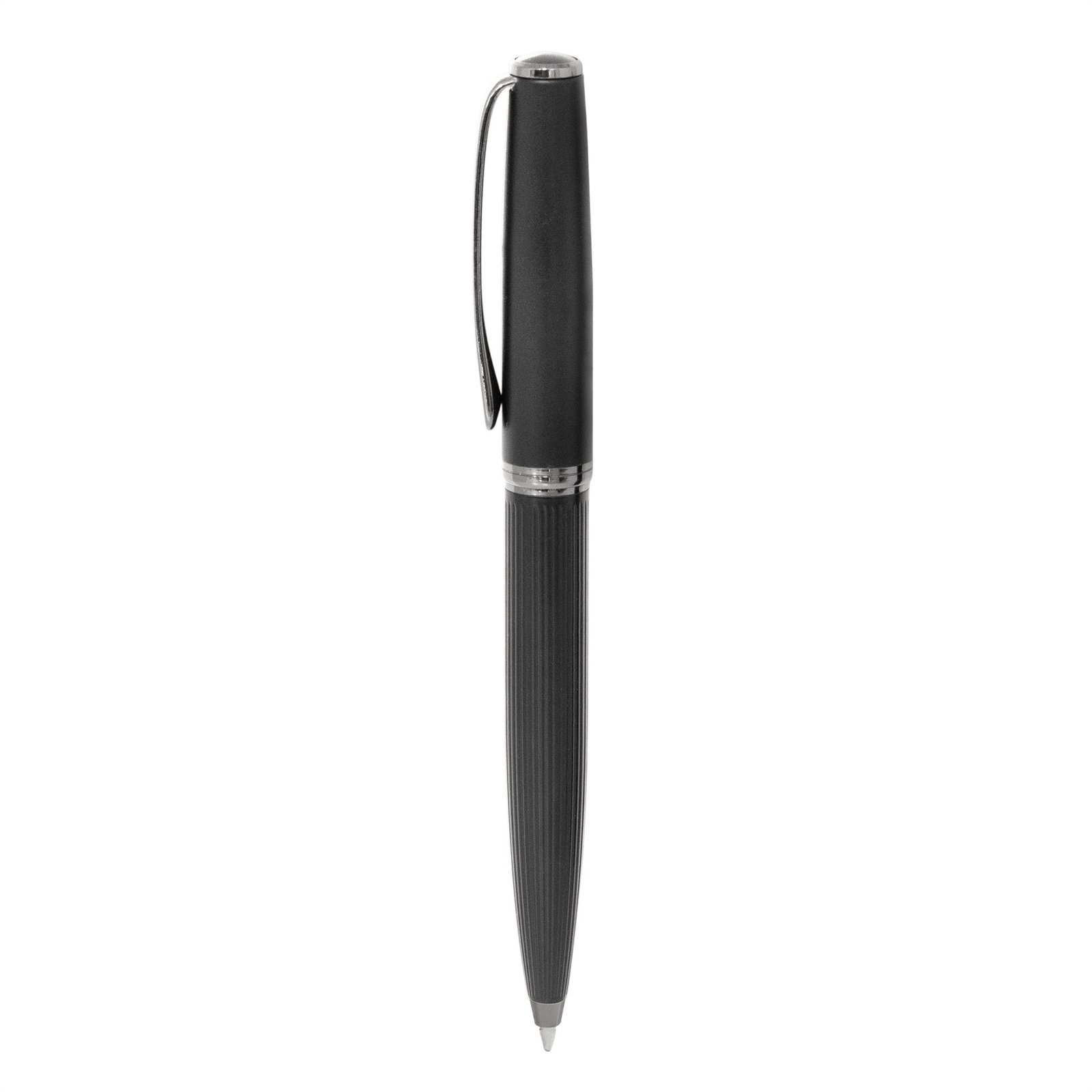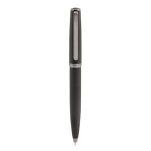 Metálico. Cuerpo color negro mate. Puntera, clip y anillo metálico. Apertura giratoria. En la parte superior destape electroplateado. Parte inferior texturada para mejor agarre. Tinta negra. Recarga metálica. Presentación en caja de regalo.