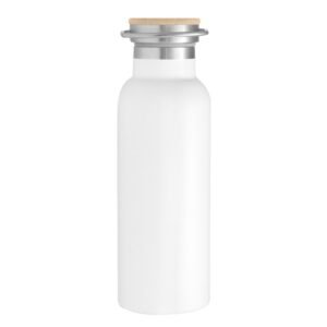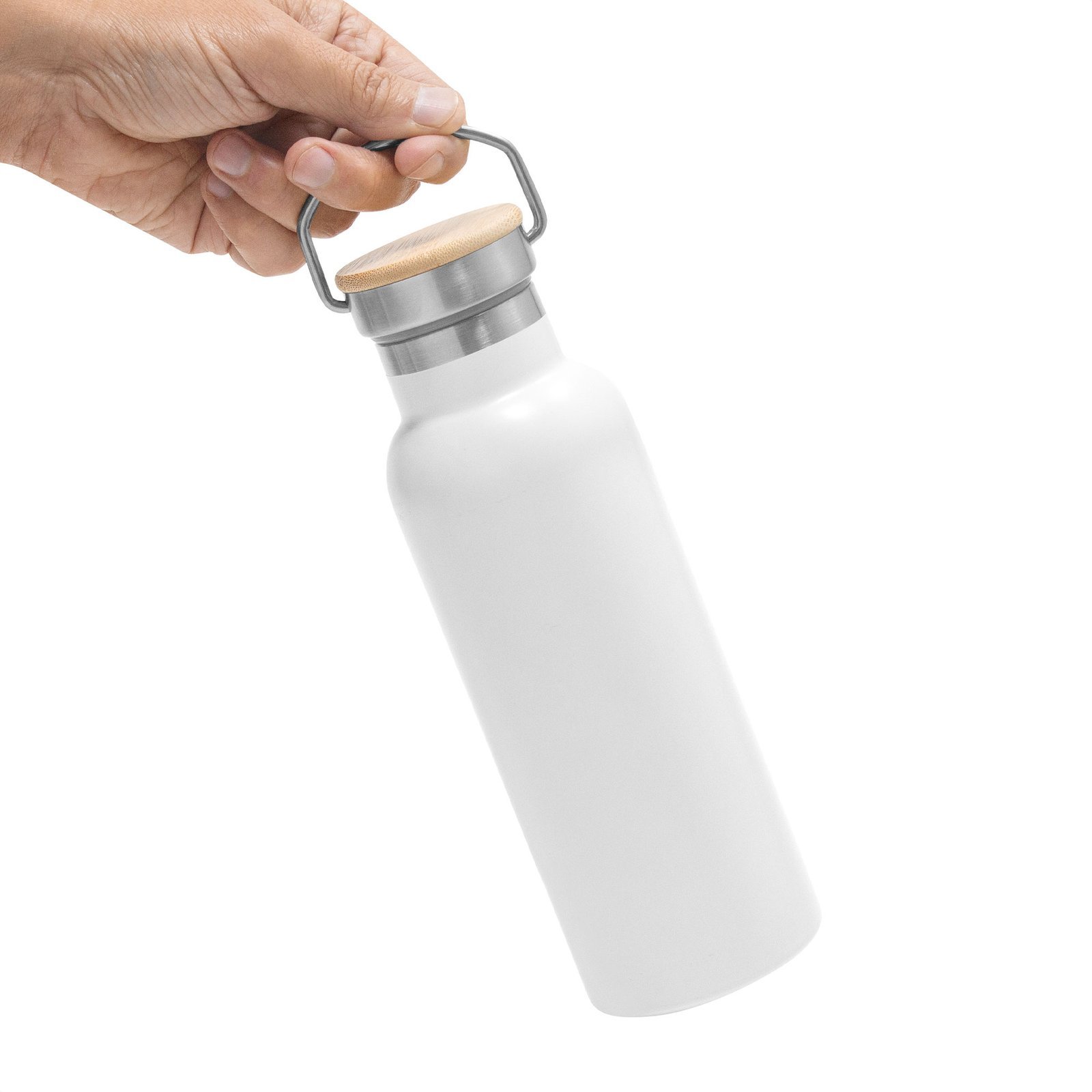 7,2 x 22,3 cm. Capacidad 550 ml. Acero inoxidable. Botella con aislamiento térmico vacuum. Interior en acero 304 y exterior en acero 201. Tapa de acero inoxidable con manija metálica rebatible y detalles en bambú. Anillo de silicona antiderrame. Mantiene por más de 12 hs la temperatura de las bebidas calientes y 24 hs de las bebidas frías. Presentación en caja de regalo Kraft.