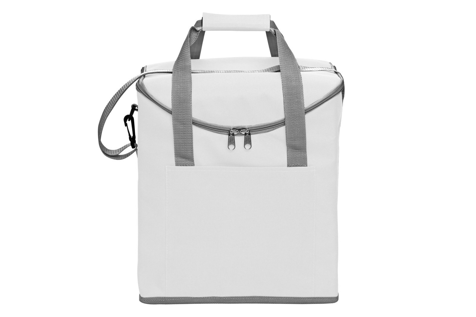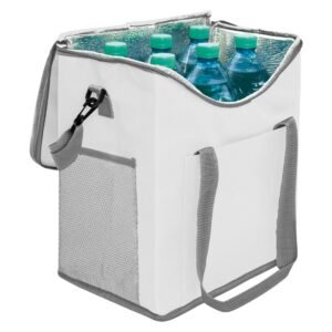 30 x 34 x 19,5 cm. Capacidad 37 litros. Poliéster. 600D Lonchera térmica con recubrimiento interior metalizado. Un bolsillo frontal y dos bolsillos laterales de red. Correa tipo bandolera y dos manijas reforzadas con cierre de velcro. Capacidad hasta 6 botellas de 2,5 litros