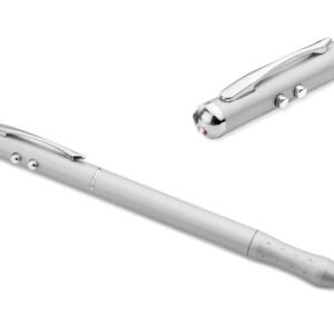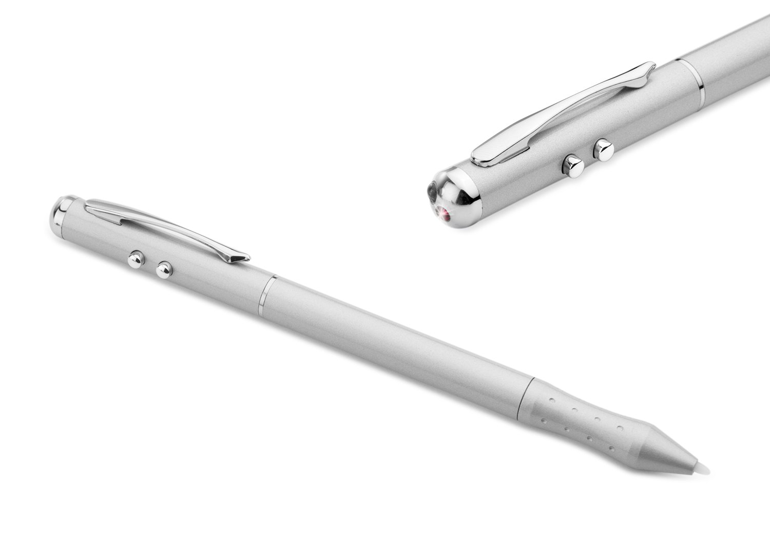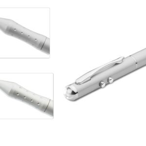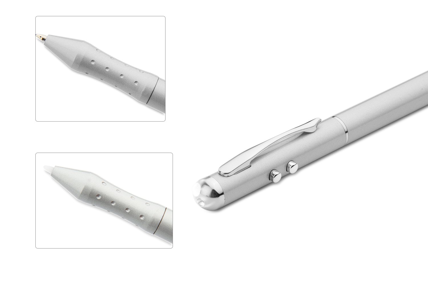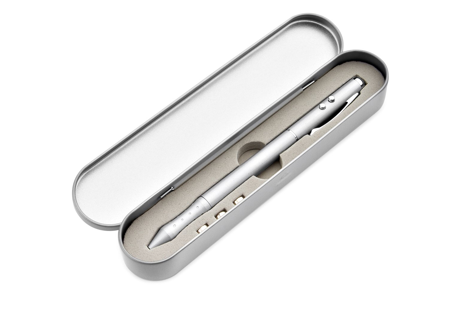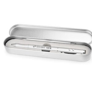 Bolígrafo con Linterna y láser, sistema de apertura Twist, incluye estuche metálico Individual y 3 pilas de repuesto. Útil como herramienta práctica para presentaciones, enseñanza, reuniones, discursos y capacitaciones. Puntero para pantallas Resistivas que normalmente son de uso profesional y de precisión. Como dispositivos bancarios por ejemplo. (Bolígrafo/Esfero)
