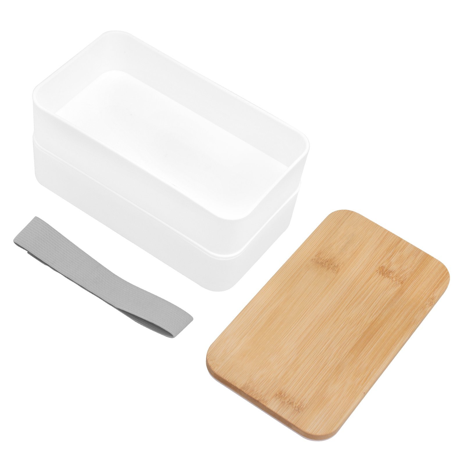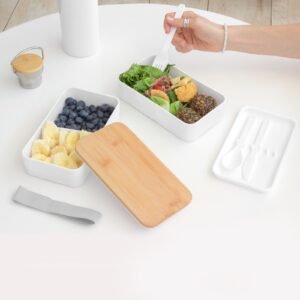 & Free ShippingContenedor de alimentos con tapa de Bambú. Posee dos compartimentos plásticos, un separador y bandeja porta set de 3 cubiertos (cuchillo, tenedor, cuchara). La tapa de bambú debe presionar firmemente la bandeja donde se fija el juego de cubiertos. Cierre con sujeción elástica color gris. Producto apto para microondas (sin la tapa). Importante: solo se puede calentar la comida, NO sirve para cocinarla.