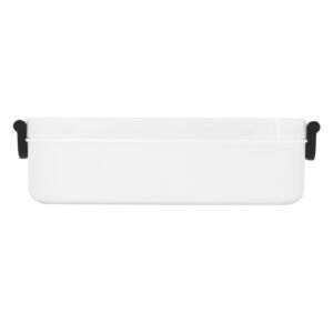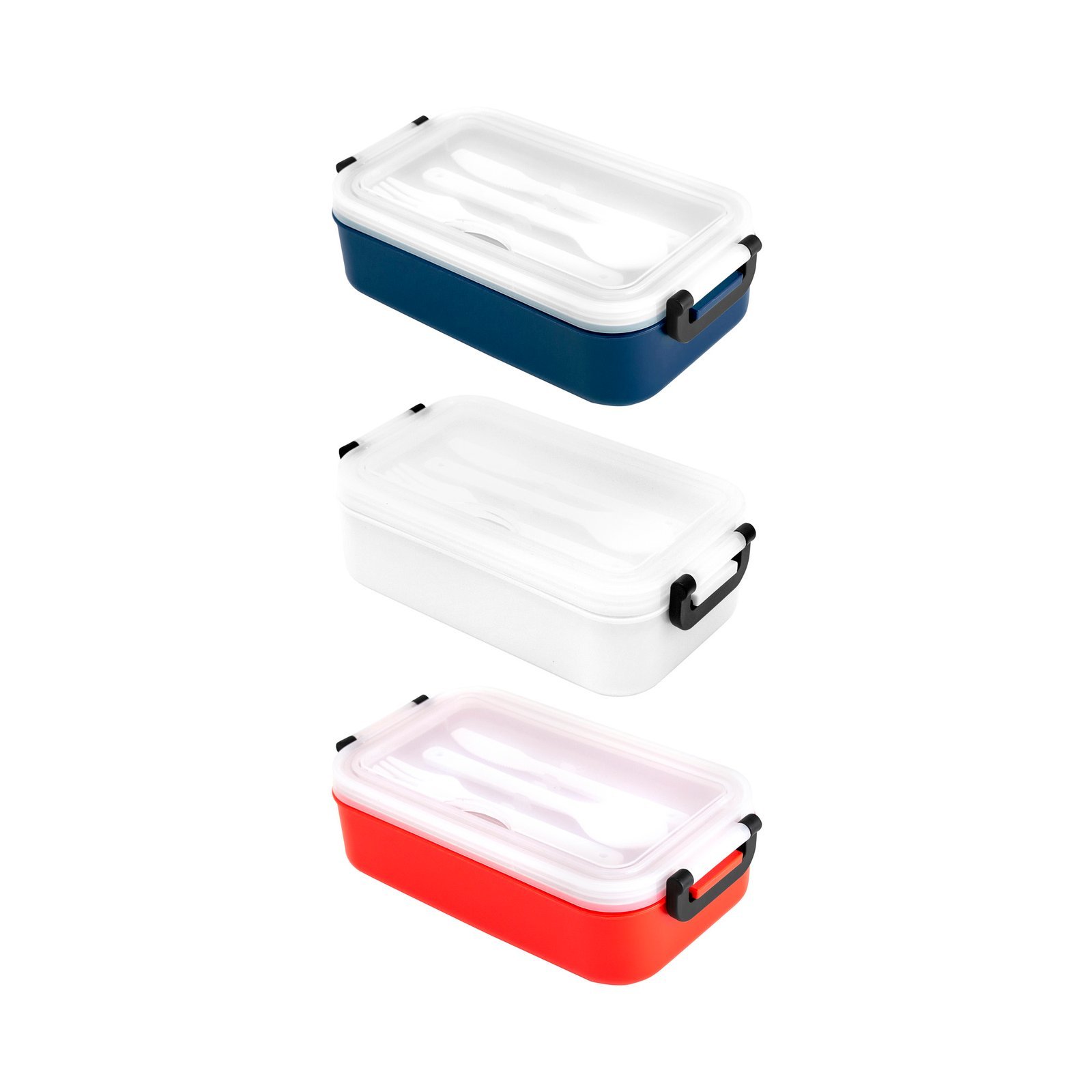 11,5 x 5,8 x 21,5 cm. Plástico PP. Contenedor de alimentos. Tapa translúcida con bandeja porta cubiertos, anillo de silicona antiderrame y ajustes de seguridad en sus laterales. Set de 3 cubiertos plásticos de color blanco (tenedor, cuchillo, cuchara) de 15 cm de largo.