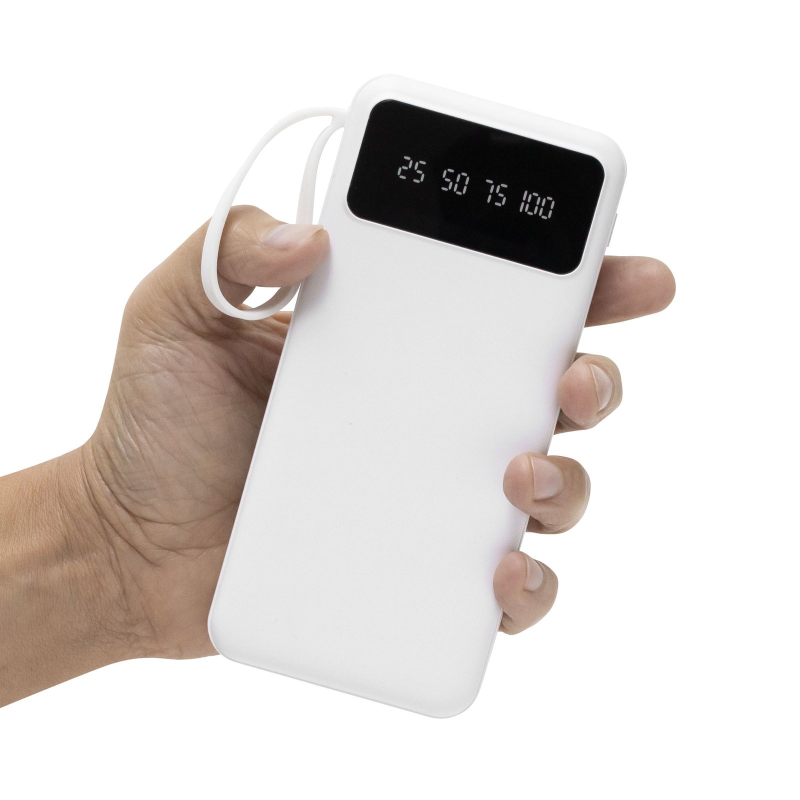 & Free Shipping14,6 x 6,7 x 2 cm. Capacidad: 10000 mAh. Plástico ABS. Powerbank multipuerto. Cables de carga incorporados. Entrada: 5V/2A. Salida: 5V/2A. Posee doble entrada tipo C y Micro. 2 salidas USB y 4 cables de carga incorporados: USB, Micro USB, Tipo C y Lightning. Puede cargar hasta 5 dispositivos al mismo tiempo. Display digital con 4 luces led con números. Incluye soporte para celular. Correa de silicona. Presentación en caja de regalo kraft.