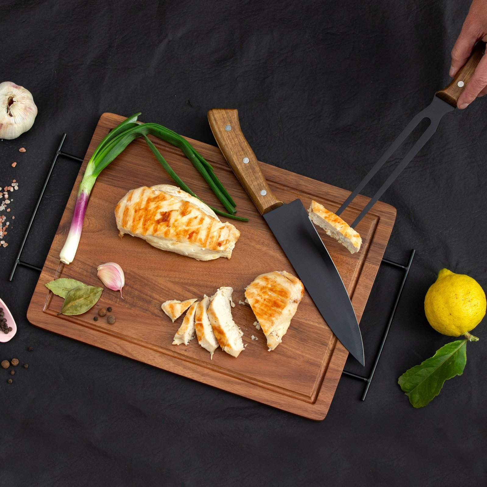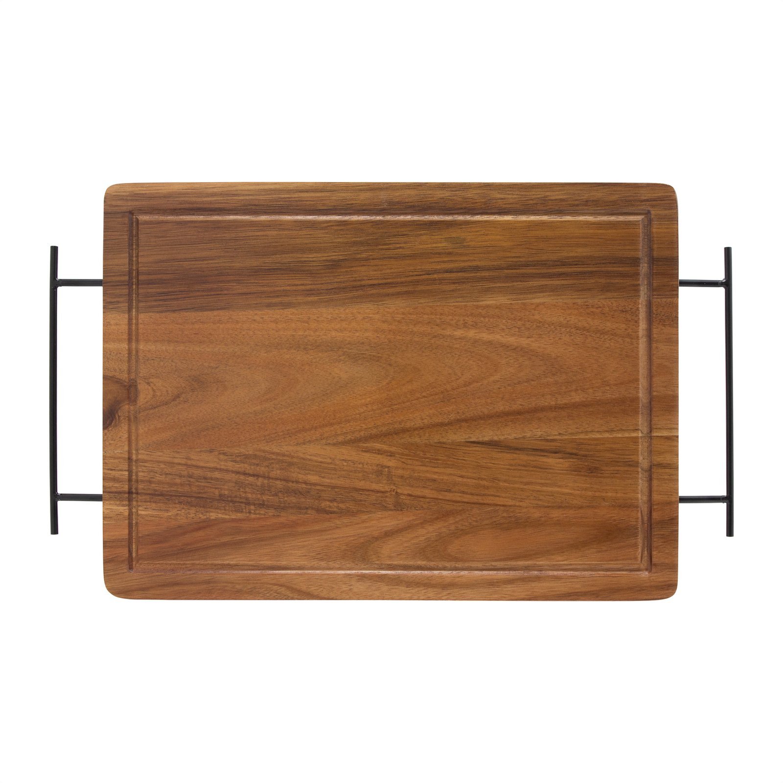 & Free Shipping3 x 26 x 1,2 cm. Madera y acero inoxidable. Set de asado. Tabla de corte / Bandeja de madera de acacia con asa de ambos lados de acero de carbono. Contiene 2 utensilios de acero inoxidable 420 y mangos de madera de acacia: Cuchillo de 33,5 cm y 150 g, y Tenedor de 31,5 cm y 115 g. Cada utensilio y el set completo se presentan en caja de regalo kraft.